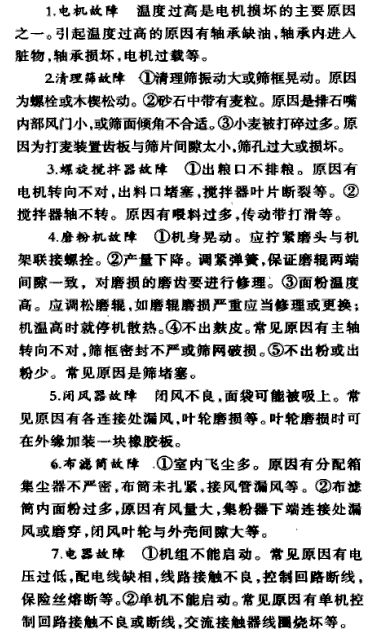 小型面粉機(jī)具有生產(chǎn)效率高、勞動(dòng)強(qiáng)度低、磨粉質(zhì)量好等特點(diǎn),深受農(nóng)村加工專業(yè)戶的歡迎。使用中常見故障如下:電機(jī)故障,清理篩故障,螺旋攪拌器故障,磨粉機(jī)故障,閉風(fēng)器故障,布濾筒故障,電器故障,主要排除方法如下: